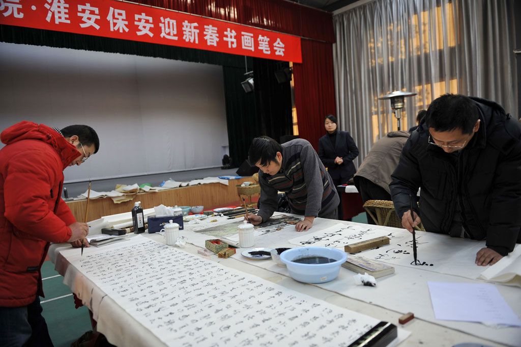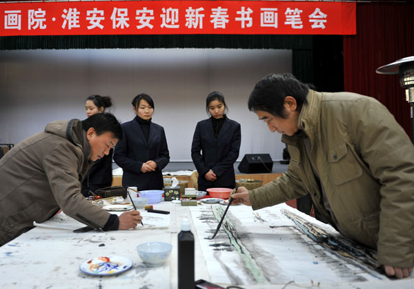 元月16日下午,由淮安書畫院和總公司聯(lián)合舉辦的“迎新春書畫筆會(huì)”活動(dòng)在公司活動(dòng)中心舉行。公司總經(jīng)理婁伯翱、副總經(jīng)理王克、徐文剛和各部門負(fù)責(zé)人蒞臨活動(dòng)現(xiàn)場(chǎng),部分保安隊(duì)伍和押運(yùn)隊(duì)伍中的書畫愛好者到現(xiàn)場(chǎng)觀摩學(xué)習(xí)。會(huì)上,書畫們齊集一堂,創(chuàng)作了一幅幅書畫精品,彰顯了保安文化特色,贏得了在場(chǎng)觀摩者們的贊賞與好評(píng)。