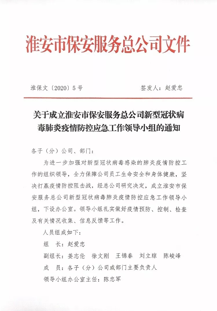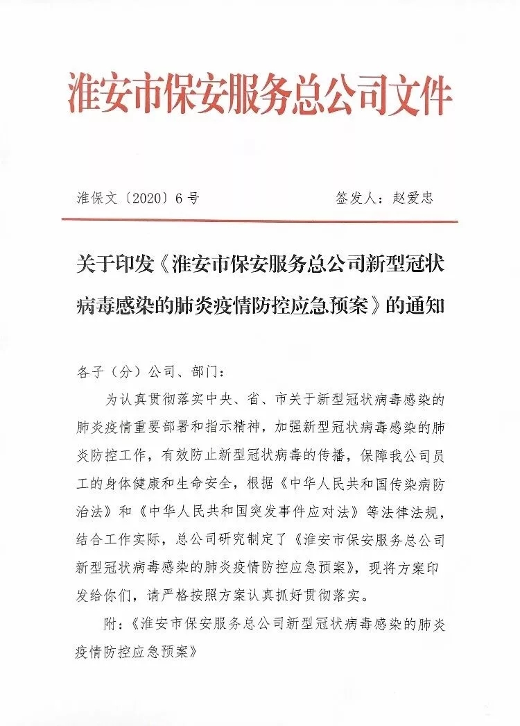疫情就是命令,防控就是責(zé)任。總公司黨總支積極應(yīng)對(duì),超前部署,1月26日,總公司制定并下發(fā)《淮安市保安服務(wù)總公司新型冠狀病毒感染的肺炎疫情防控應(yīng)急預(yù)案》、《關(guān)于成立新型冠狀病毒感染的肺炎疫情防控應(yīng)急工作領(lǐng)導(dǎo)小組的通知》、《致全體黨員的一封公開信》。春節(jié)期間,總公司黨總支書記、總經(jīng)理趙愛忠等領(lǐng)導(dǎo)班子多次深入基層督導(dǎo)疫情防控工作??偣纠梦⑿湃?、工作群對(duì)疫情防范工作進(jìn)行再部署、再安排、再要求,要求各級(jí)管理人員要把疫情防控作為當(dāng)前最大的政治任務(wù),切實(shí)履職擔(dān)責(zé),認(rèn)真抓好疫情防控工作,做到全員宣傳到位、措施到位、防范到位。