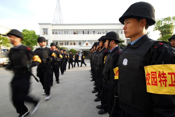 5月7日早晨6時,江蘇淮安校園特衛(wèi)隊(duì)伍武裝出發(fā)至學(xué)校進(jìn)行處突執(zhí)勤。據(jù)了解,淮安市公安部門對這支剛成立的首批特衛(wèi)隊(duì)伍全部實(shí)行軍事化管理,隊(duì)員們早晨5時30分集合,5時40分集中早餐,6時分別乘坐三輛客車到市直24所中小學(xué)、幼兒園執(zhí)勤,下午學(xué)校放學(xué)半小時后,由專車接回并進(jìn)行一天的工作總結(jié)。白天執(zhí)勤期間,還有督察人員全天候檢查,雙休日,還要進(jìn)行技能集訓(xùn)。
