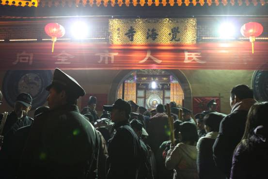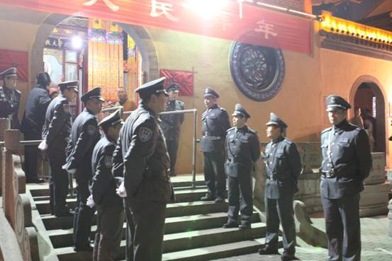 圖為:晚21時,全體保安人員分工明確,在寺廟各出入口站崗