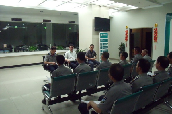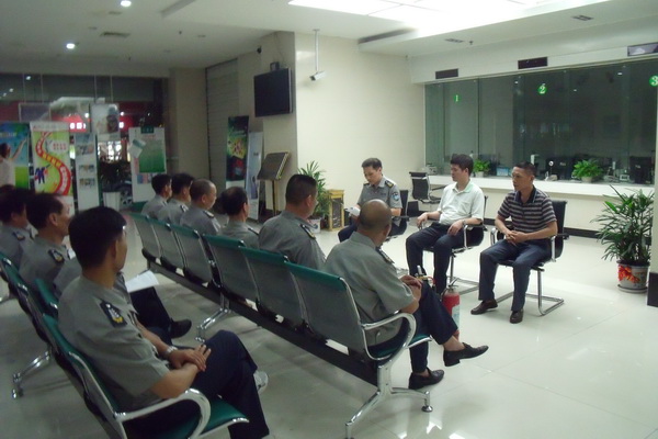 (上圖)為了組織好此次專項(xiàng)銀行突發(fā)事件應(yīng)急演練的消防安全演練,黃瑞明科長(zhǎng)和林銘春中隊(duì)長(zhǎng)以實(shí)例向保安員講解應(yīng)對(duì)犯罪嫌疑犯人在營(yíng)業(yè)廳實(shí)施搶劫暴力侵害時(shí),要以“平息事態(tài)、控制局面、防止擴(kuò)大散、減少損失”為主要原則,針對(duì)不同情況采取制止、保護(hù)、求援、疏散等方法,確保銀行營(yíng)業(yè)場(chǎng)所的安全,并對(duì)消防安全“四個(gè)能力”建設(shè)、火災(zāi)基礎(chǔ)知識(shí)、高層建筑逃生自救、辦公樓常用消防設(shè)施的檢查、使用等多個(gè)方面進(jìn)行對(duì)保安員詳細(xì)講解培訓(xùn)。
