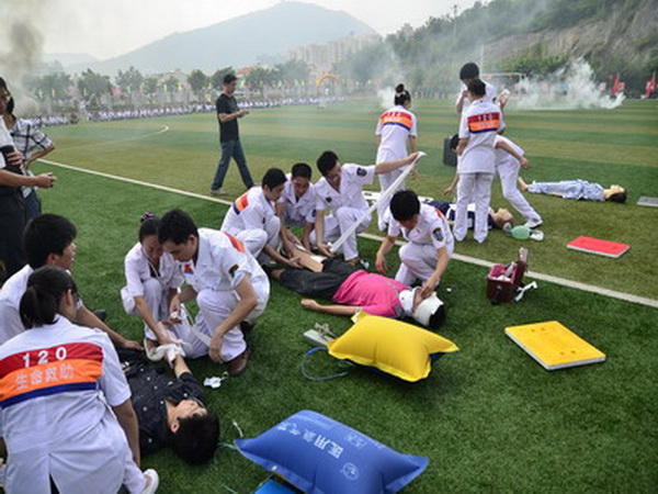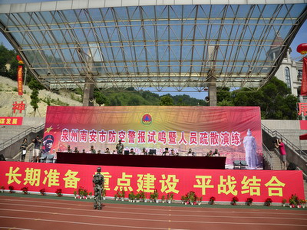 9月1日是泉州市解放63周年紀念日,泉州市人防辦每年都在這一天舉行一次防空警報試鳴暨人員疏散演練活動,主會場在各縣市輪流舉辦,各縣市設(shè)立分會場,今年的主會場設(shè)在南安市實驗中學。上午9點,泉州市人防辦、南安市人防辦在南安市實驗中學舉辦的泉州南安市防空警報試鳴暨人員疏散演練活動準時啟動,多種防空警報聯(lián)合試鳴,防化專業(yè)隊、消防專業(yè)隊、預備役營、治安巡邏專業(yè)隊、電力搶修專業(yè)隊、自來水搶修專業(yè)隊、醫(yī)療救護專業(yè)隊等多種人防專業(yè)隊參與救援演練。為確保演練取得成功,該市保安協(xié)警和校園專職保安及師生等700多人參與疏散演練。