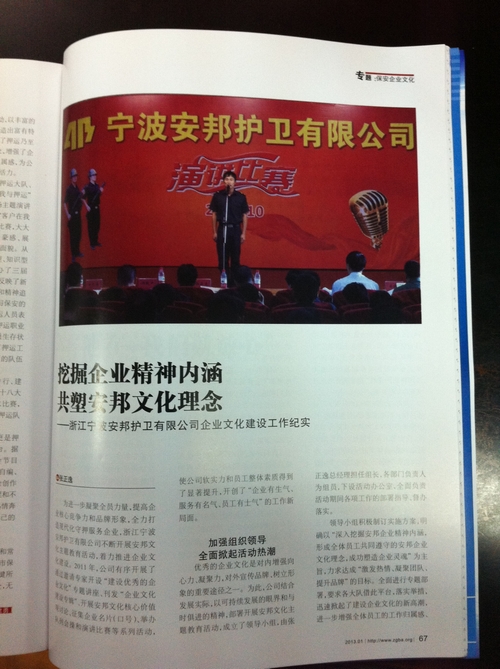 2012年,寧波安邦護(hù)衛(wèi)有限公司通過開設(shè)“建設(shè)優(yōu)秀的企業(yè)文化”專題講座、刊發(fā)“企業(yè)文化建設(shè)專輯”、組織安邦文化核心價值觀討論、征集企業(yè)名片(口號)、舉辦隊列會操和演講比賽等活動,著力推進(jìn)企業(yè)文化建設(shè),顯著提升公司軟實力、核心競爭力和員工整體素質(zhì),取得了一定成效。2013年1月,今年第1期《中國保安》(總第279期)雜志 “保安企業(yè)文化”專題欄目刊登《挖掘企業(yè)精神內(nèi)涵,共塑安邦文化理念——浙江寧波安邦護(hù)衛(wèi)有限公司企業(yè)文化建設(shè)工作紀(jì)實》,對寧波安邦護(hù)衛(wèi)有限公司企業(yè)文化建設(shè)情況進(jìn)行了報道,進(jìn)一步擴大了公司的行業(yè)知名度和社會影響力。