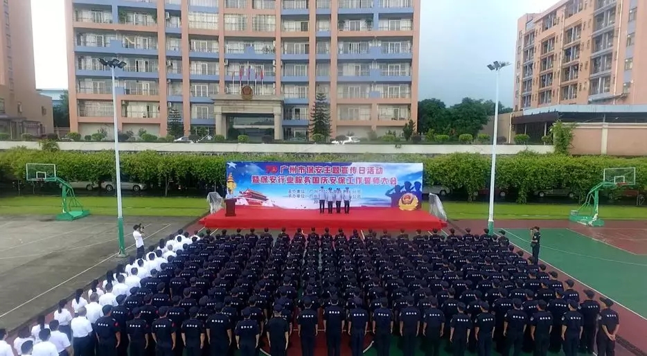 隨著大會主持溫遠(yuǎn)峰宣布大會開始,誓師大會在雄壯的國歌聲中拉開序幕。番禺區(qū)保安服務(wù)公司5個(gè)片區(qū)、1個(gè)機(jī)動大隊(duì)共300余人隊(duì)列嚴(yán)整,精神抖擻,彰顯了保安隊(duì)伍良好的精神風(fēng)貌和高昂斗志,表明全體保安員打贏國慶70周年安保的堅(jiān)定決心。