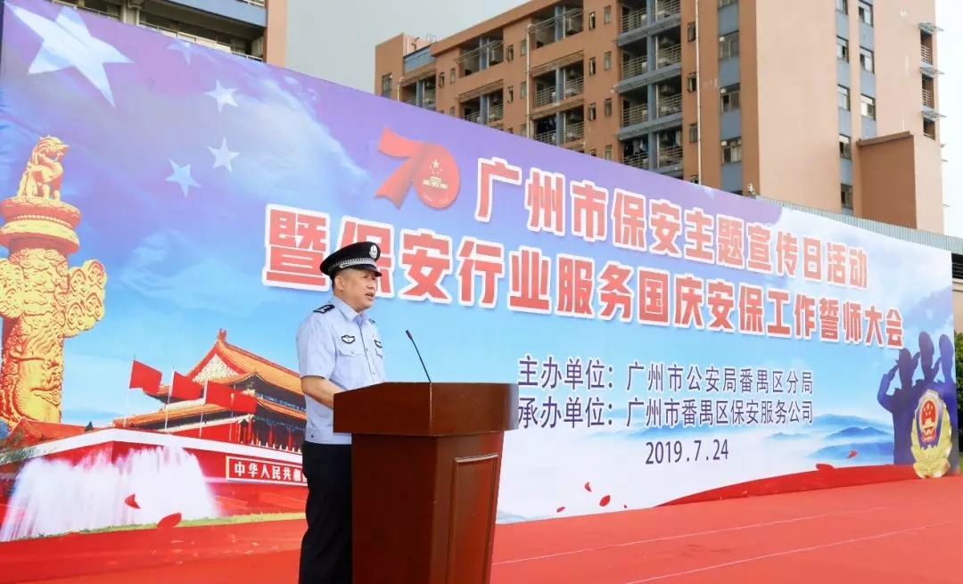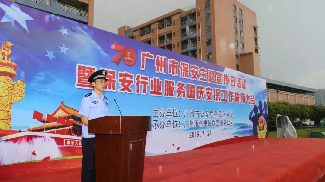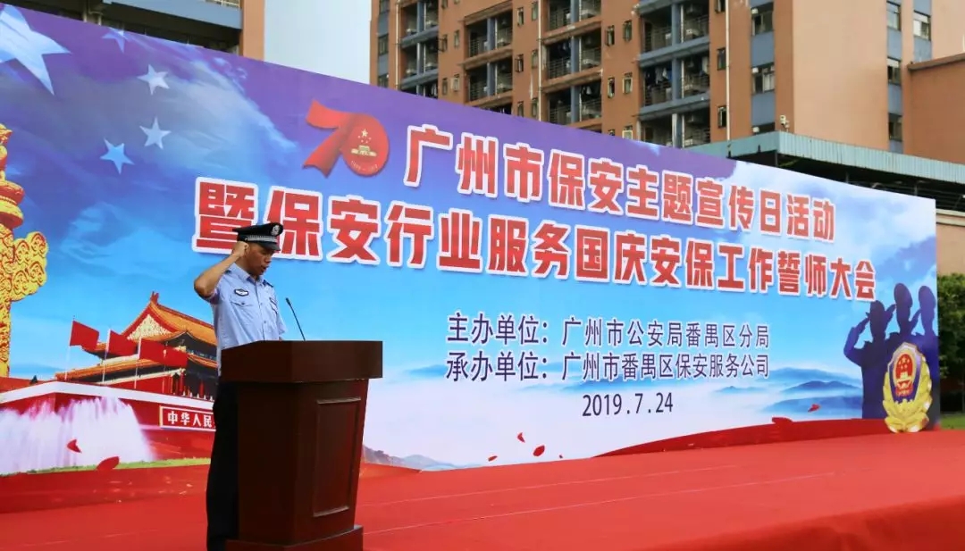 “不忘初心跟黨走,牢記使命勇?lián)?dāng)”。為扎實(shí)做好國慶70周年大慶安保維穩(wěn)工作,確保社會治安穩(wěn)定。7月24日上午,番禺區(qū)保安服務(wù)公司在公司運(yùn)動場隆重舉行保安主題宣傳日活動暨保安行業(yè)服務(wù)國慶安保工作誓師大會。廣州市公安局番禺區(qū)分局治安大隊(duì)葉文福副大隊(duì)長、三級警長何靖毅出席了大會,公司黨支部書記謝燕彪、副書記陳志雄、委員溫遠(yuǎn)峰和300多名保安從業(yè)人員參加了大會,大會由公司支部委員溫遠(yuǎn)峰主持。