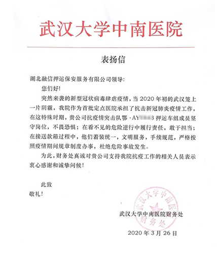近日,廣電運(yùn)通下屬成員企業(yè)湖北融信收到了一封來(lái)自武漢大學(xué)中南醫(yī)院的表?yè)P(yáng)信,信中對(duì)湖北融信中南醫(yī)院服務(wù)車組在疫情期間堅(jiān)守崗位、不畏恐懼、敢于擔(dān)當(dāng)、文明服務(wù)的工作表現(xiàn)給予了充分肯定與表?yè)P(yáng),并對(duì)湖北融信給予醫(yī)院抗疫工作的支持與幫助表示衷心感謝。