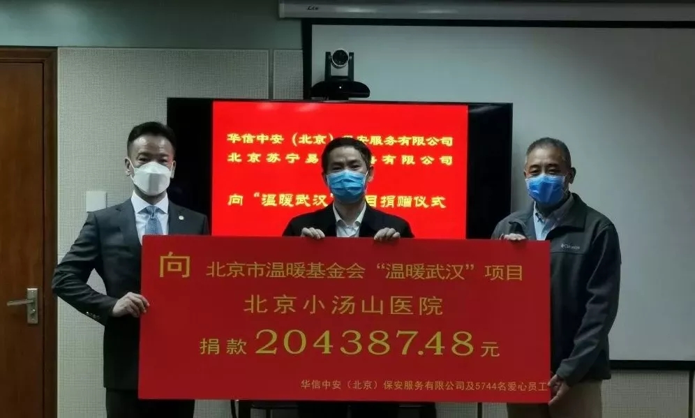 捐贈儀式上華信中安集團董事長殷衛(wèi)宏將公司以及5744名愛心員工所捐共計204387.48元的善款捐贈至北京市溫暖基金會,并通過溫暖基金會定向捐贈北京市小湯山醫(yī)院的醫(yī)務(wù)工作者。殷衛(wèi)宏董事長表示,華信中安始終把企業(yè)社會責(zé)任融入公司的發(fā)展戰(zhàn)略中,企業(yè)既是社會繁榮的創(chuàng)造者,也是社會資源的消耗者,企業(yè)與社會共生的關(guān)系就決定了我們必須履行社會責(zé)任。近年來我們先后為汶川、玉樹等災(zāi)區(qū)及北京青少年發(fā)展基金會、希望工程北京捐助中心等機構(gòu),累計捐款達300多萬元。同時華信中安作為“北京市保安員專項溫暖基金”創(chuàng)始發(fā)起六家企業(yè)之一,也一貫致力于幫扶全市一線困難保安員。八方攜手共渡難關(guān),萬眾一心抗擊疫情。自疫情爆發(fā)以來,華信中安人全面動員迅速部署積極投身疫情防控的第一線,為駐勤服務(wù)項目織就一張張堅實穩(wěn)固的防控網(wǎng),同時廣大員工也通過捐款的方式盡己所能為社會注入溫暖力量。我們將善款通過溫暖基金會定向捐贈北京市小湯山醫(yī)院的醫(yī)務(wù)工作者,希望能切實為醫(yī)務(wù)工作者解決實際問題,為我們以決戰(zhàn)決勝姿態(tài)奪取抗擊疫情阻擊戰(zhàn)的全面勝利增添信心。