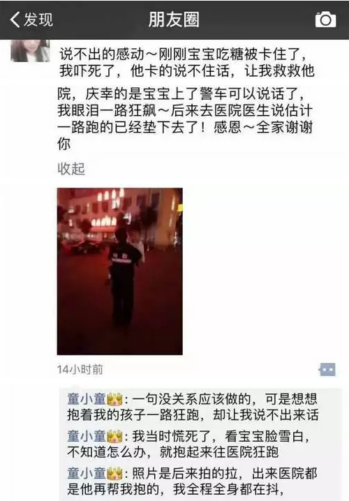 這個就是那條求助信息,照片中一名特勤隊員緊緊的抱著一個孩子。發(fā)布人童女士對照片描述大意是:孩子被糖果卡住了情況危急,情急之下一名巡邏的特勤隊員抱起孩子第一時間趕到了醫(yī)院,孩子轉危為安。她很希望找到這個好心的特勤隊員。
