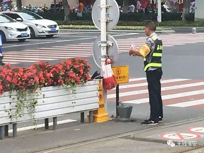照片中,一位有軌電車保安隊員在酷暑中堅守崗位,他的腳邊放著一只小鐵桶,執(zhí)勤過程中實在熱了,他就用毛巾擰一把擦汗降溫。市民周先生被這一幕深深感動,遠遠的拍下了幾張照片。