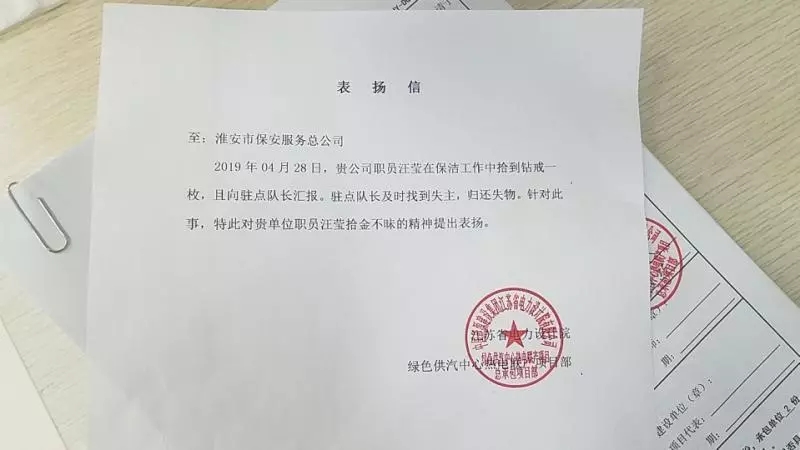 2019年5月1日,駐外分公司收到來自中國能源建設(shè)集團江蘇省電力設(shè)計院有限公司發(fā)來的表揚信,感謝淮安保安駐江蘇省電力設(shè)計院有限公司隊員汪瑩在4月28日的保潔工作中拾金不昧,撿到鉆戒后立即向隊長匯報,駐點隊長及時通報客戶單位并采取相應(yīng)措施聯(lián)系到失主,歸還失物。失主非常感謝汪瑩,客戶單位對淮安保安派駐的保潔員汪瑩同志拾金不昧的精神提出了表揚,對淮安保安進(jìn)駐后的工作也表示認(rèn)可!