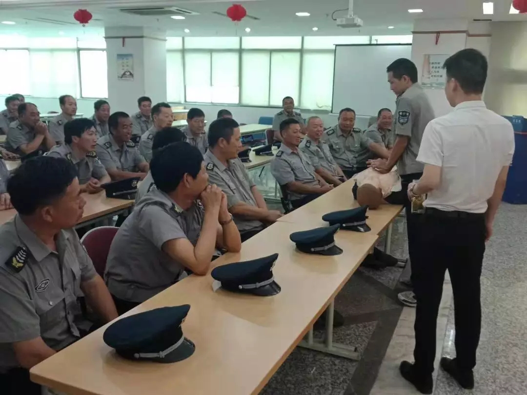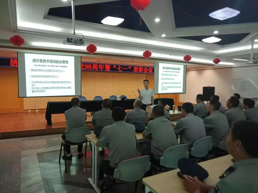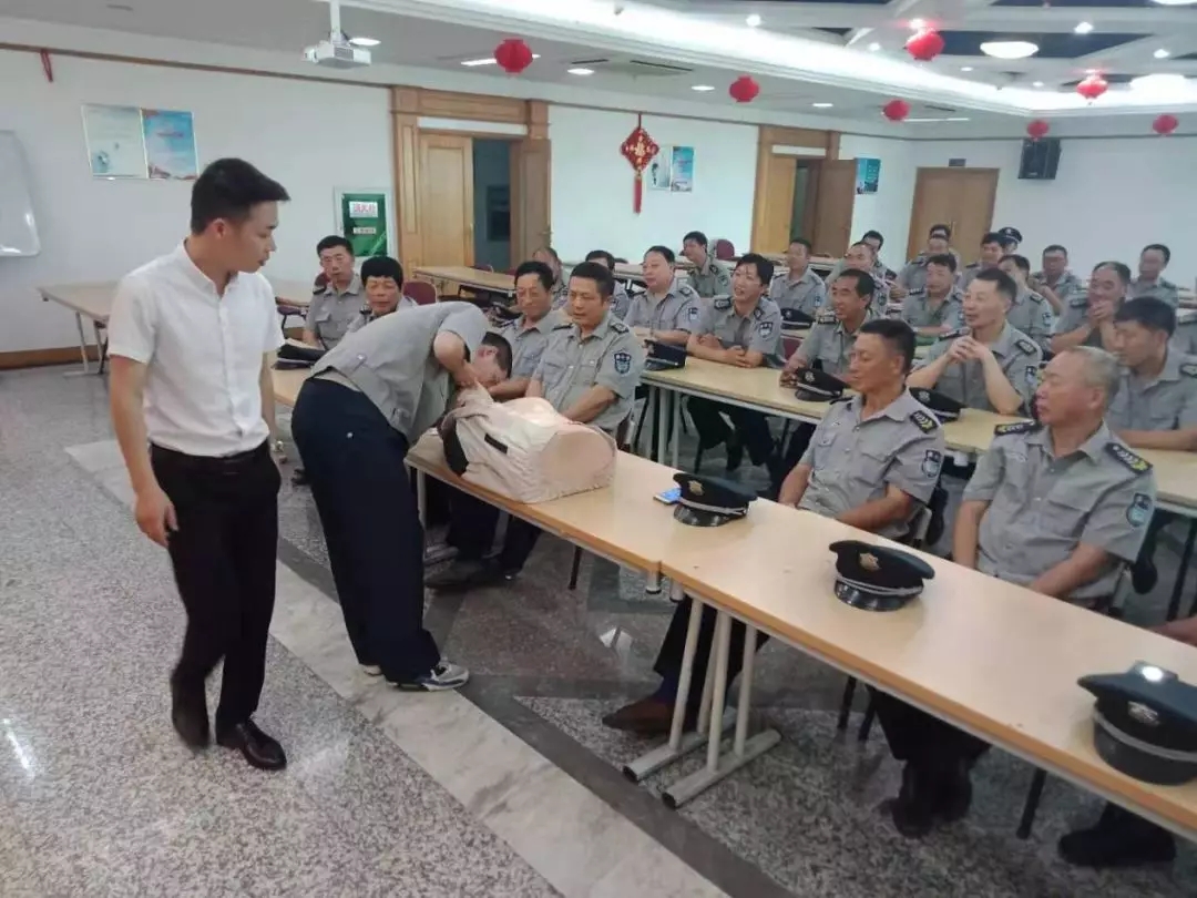 孫老師詳細(xì)講解了突發(fā)事件現(xiàn)場處理中,人工呼吸、胸外按壓的方法與步驟,并挑選骨干現(xiàn)場互動演示。在活動過程中,孫老師針對保安員的年齡結(jié)構(gòu)及職業(yè)性質(zhì),詳細(xì)分析講授了常見職業(yè)病的預(yù)防和改善、慢性疾病的預(yù)防、心理健康知識和中醫(yī)養(yǎng)生知識。