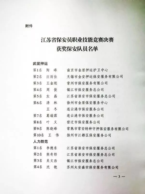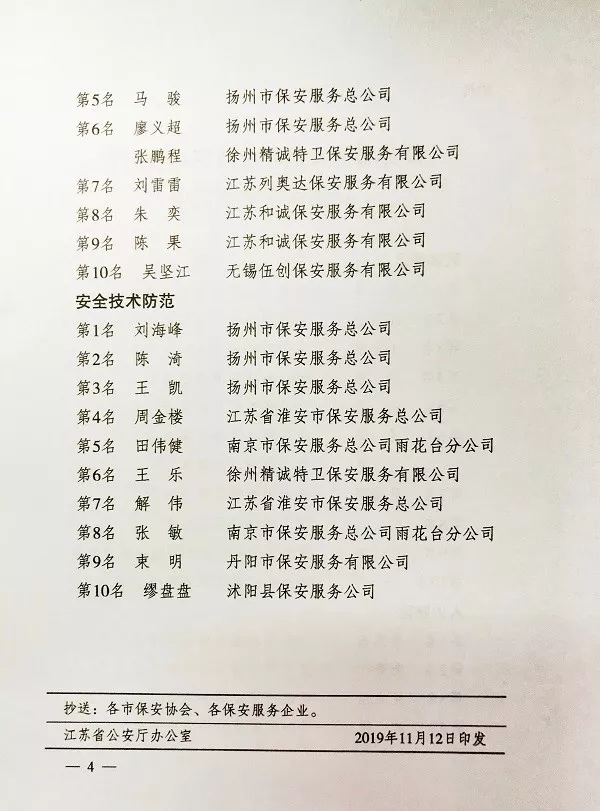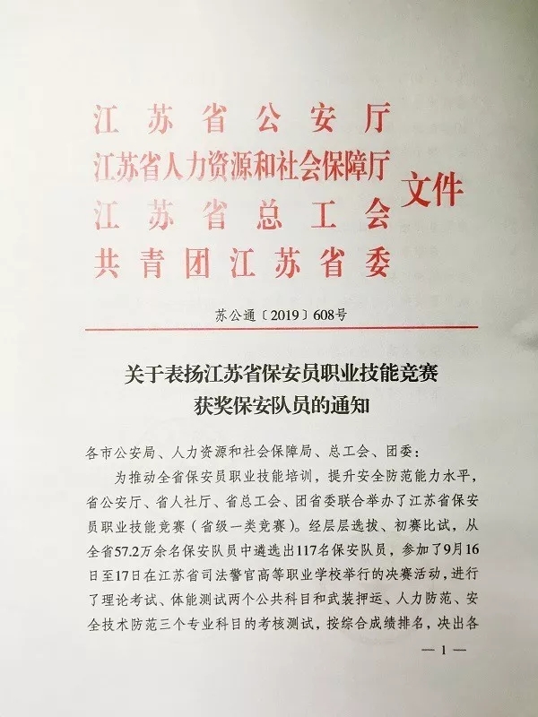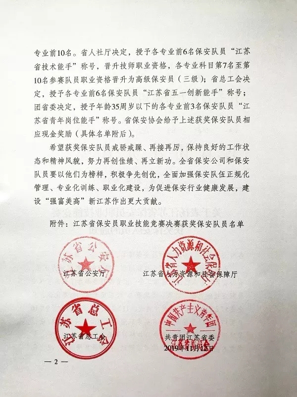 11月12日,江蘇省公安廳、江蘇省人力資源和社會(huì)保障廳、江蘇省總工會(huì)、共青團(tuán)江蘇省委聯(lián)合發(fā)文,祝賀、表?yè)P(yáng)獲獎(jiǎng)保安員,并對(duì)各科目進(jìn)入前六名的獲獎(jiǎng)人員分別授予“江蘇省技術(shù)能手”、“江蘇省五一創(chuàng)新能手”和“江蘇省青年崗位能手”榮譽(yù)稱號(hào)。