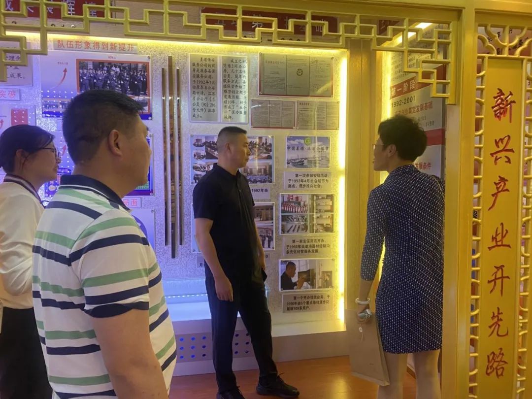 在江蘇泰姜保安服務(wù)有限公司,考察組一行參觀了武裝押運場所和公司發(fā)展史展廳。泰姜保安公司黨支部書記、總經(jīng)理邱小琳介紹了當前企業(yè)發(fā)展狀況,雙方圍繞國企運營模式、安全管理、業(yè)務(wù)延伸、隊伍建設(shè)等方面進行了交流探討。